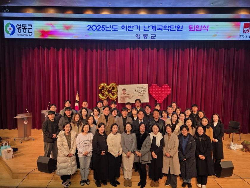충북 영동군은 지난 17일 국악체험촌 우리소리관 공연장에서 ‘2025년 하반기 난계국악단 퇴임식’을 개최하고, 33년간 난계국악단에서 활동해 온 대금 연주자 김종찬 단원의 퇴임을 기념하는 뜻깊은 시간을 가졌다고 밝혔다.