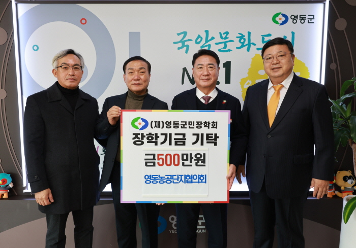 충북 영동농공단지 기업인 협의회(회장 이명열)는 5일 영동군청을 방문해 지역 미래 인재를 육성하기 위한 장학금 500만 원을 (재)영동군민장학회에 기탁했다.