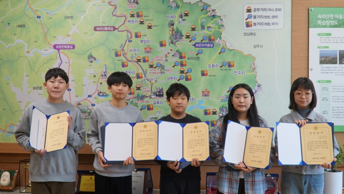 지역인재 양성을 목표로 2024년 발족한 속리산장학회는 그동안 모은 소중한 장학금을 졸업을 앞둔 수정초등학교 6학년 학생 전원 5명에게 각 20만원씩 전달하며 학생들의 미래를 응원했다.