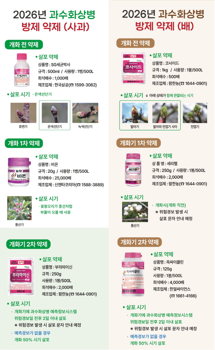 또한 개화기 살포 적기는 과수화상병 예측정보시스템(http://fireblight.org)을 통해 확인할 수 있으며, 위험경보가 발령될 경우 문자 안내도 병행할 예정이다.