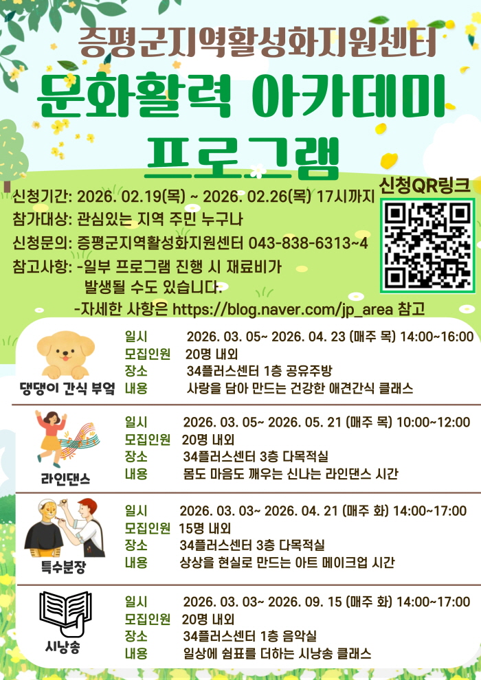 충북 증평군이 34플러스센터를 활용한 ‘문화활력 아카데미’ 프로그램 수강생을 모집한다.