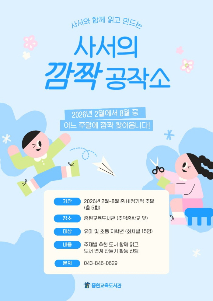신기철 중원교육문화원장은 “사서가 직접 책을 읽어주고 함께 만드는 활동을 통해 아이들이 책과 도서관을 더욱 친근하게 느낄 수 있을 것”이라며 “앞으로도 독서와 체험을 결합한 다양한 프로그램을 지속적으로 운영하겠다”고 말했다.