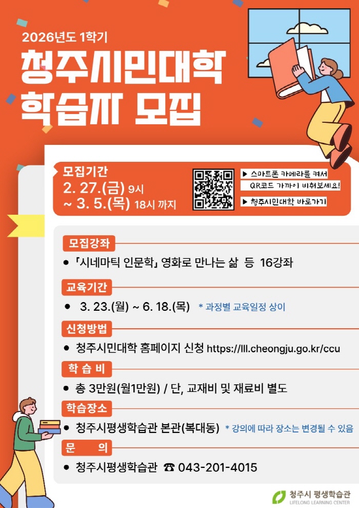 충북 청주시평생학습관은 2026년 1학기 ‘청주시민대학’에 참여할 학습자를 3월 5일까지 모집한다고 27일 밝혔다.