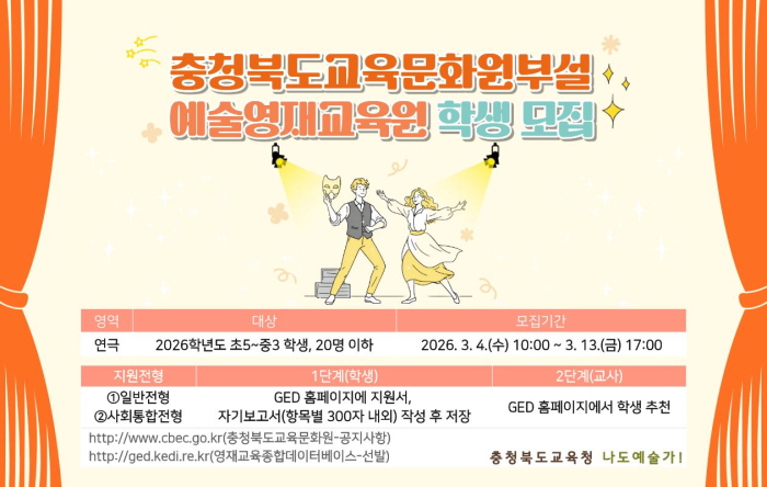 충청북도교육청 직속기관 충청북도교육청 교육문화원(원장 서종덕) 부설 예술영재교육원은 4일 연극을 통해 예술적 재능을 키울 2026학년도 신입생을 모집한다고 밝혔다.