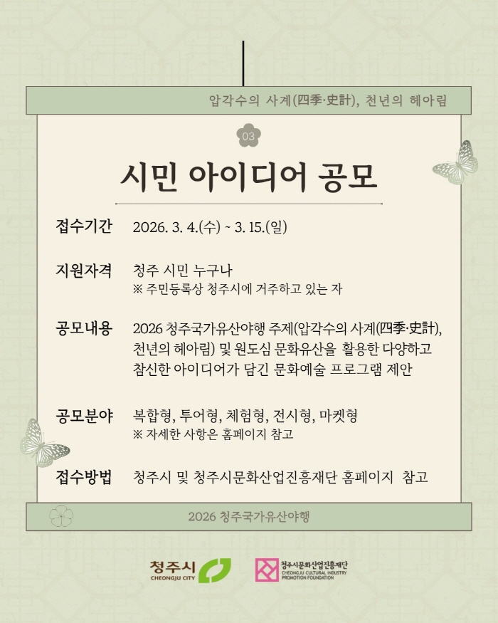 충북 청주시와 청주시문화산업진흥재단은 오는 3월 15일까지 ‘2026 청주 국가유산 야행’ 시민 아이디어 공모를 진행한다고 밝혔다.