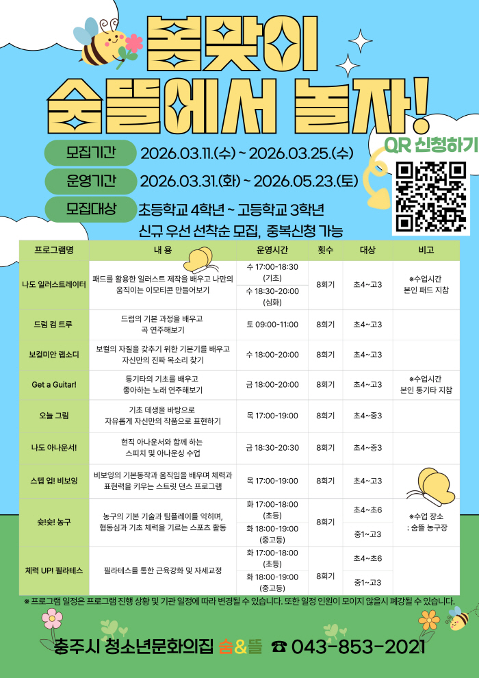 충북 충주시 청소년문화의집 숨&뜰(관장 고미숙, 이하 숨&뜰)은 ‘2026년 봄맞이 숨뜰에서 놀자!’ 프로그램 참가자를 3월 11일부터 3월 25일까지 선착순 모집하고 있다고 밝혔다.