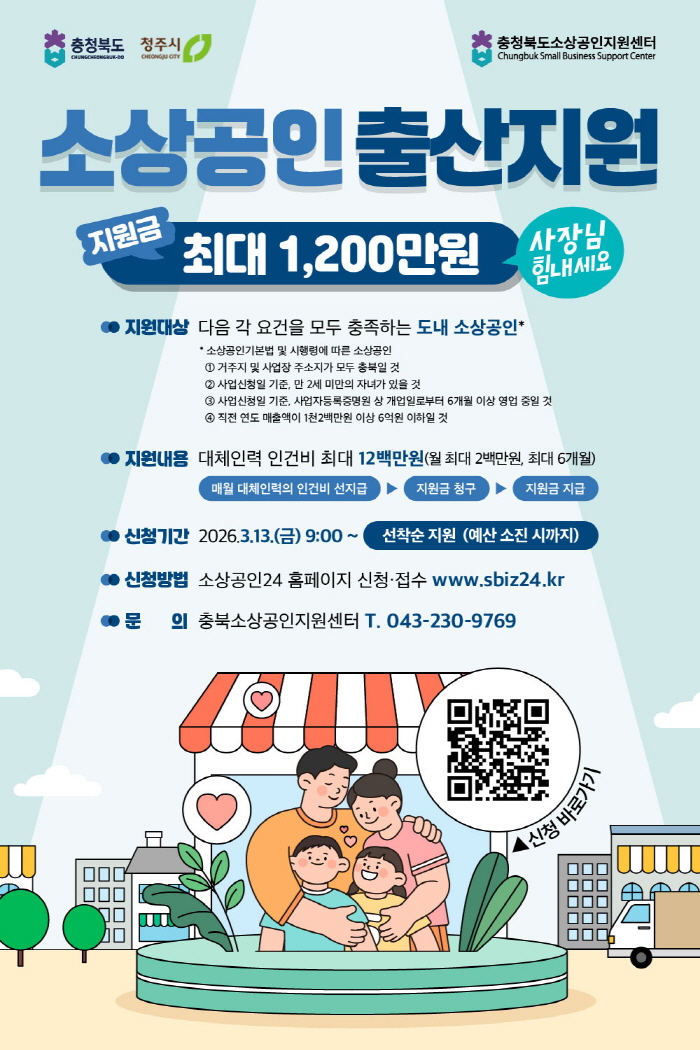 충북 청주시는 출산과 육아로 인해 경영에 어려움을 겪는 소상공인을 위해 ‘소상공인 출산 지원사업’을 본격 시행한다고 23일 밝혔다.