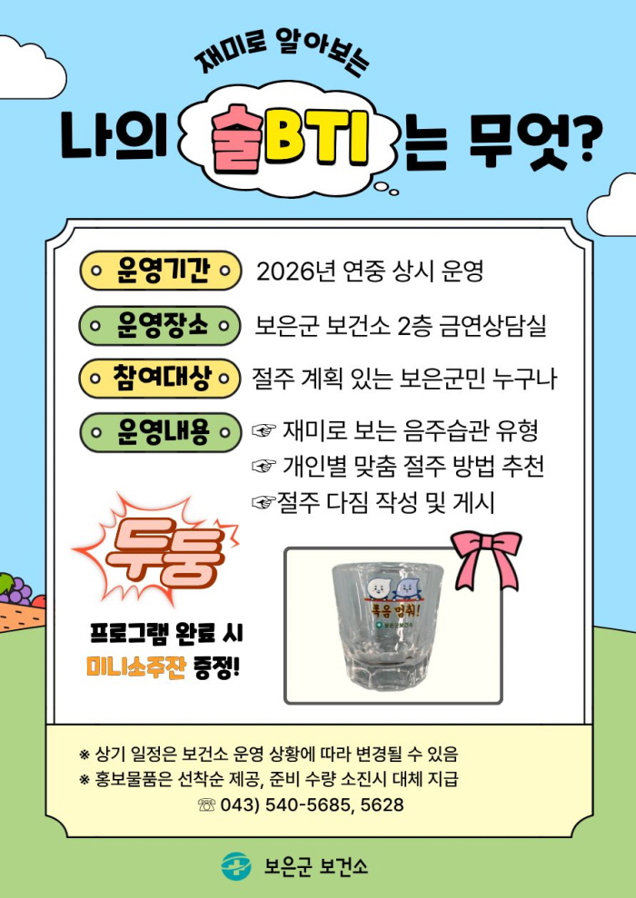 충북 보은군보건소(소장 홍종란)는 군민의 건전한 음주문화 조성과 건강 증진을 위해 참여형 절주 프로그램을 4월부터 연중 상시 운영한다고 26일 밝혔다.