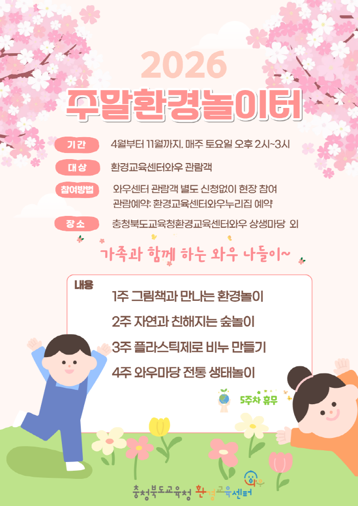 충청북도교육청 환경교육센터와우는 어린이의 환경 감수성 함양과 기후·환경 이해 증진을 위해 2026학년도 ‘주말 환경 놀이터’를 운영한다고 밝혔다.